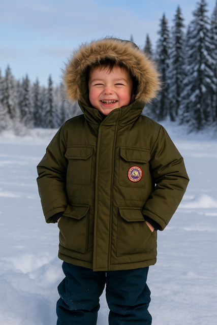 Voor de jongens is er een coole legergroene jas met een warme bondkraag.