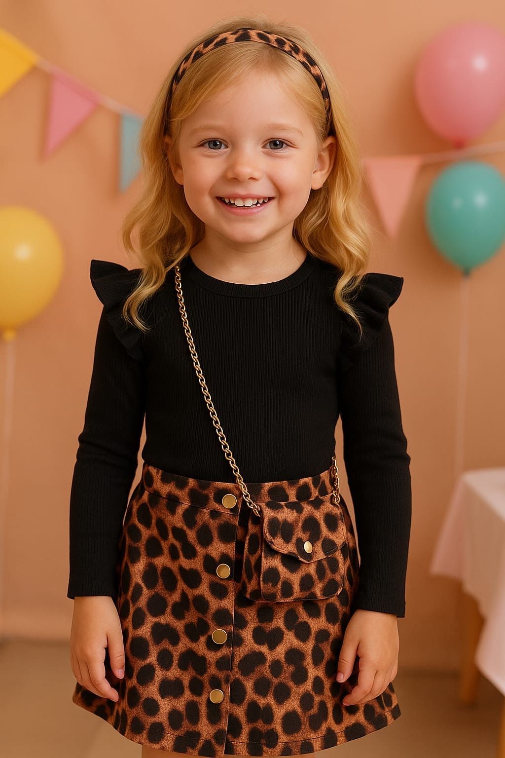 Dit prachtige jurkje heeft een trendy panterlook. Daarnaast is er een schattig tasje in dezelfde panterstijl. Het jurkje is voorzien van zwarte biesjes op de schouders.